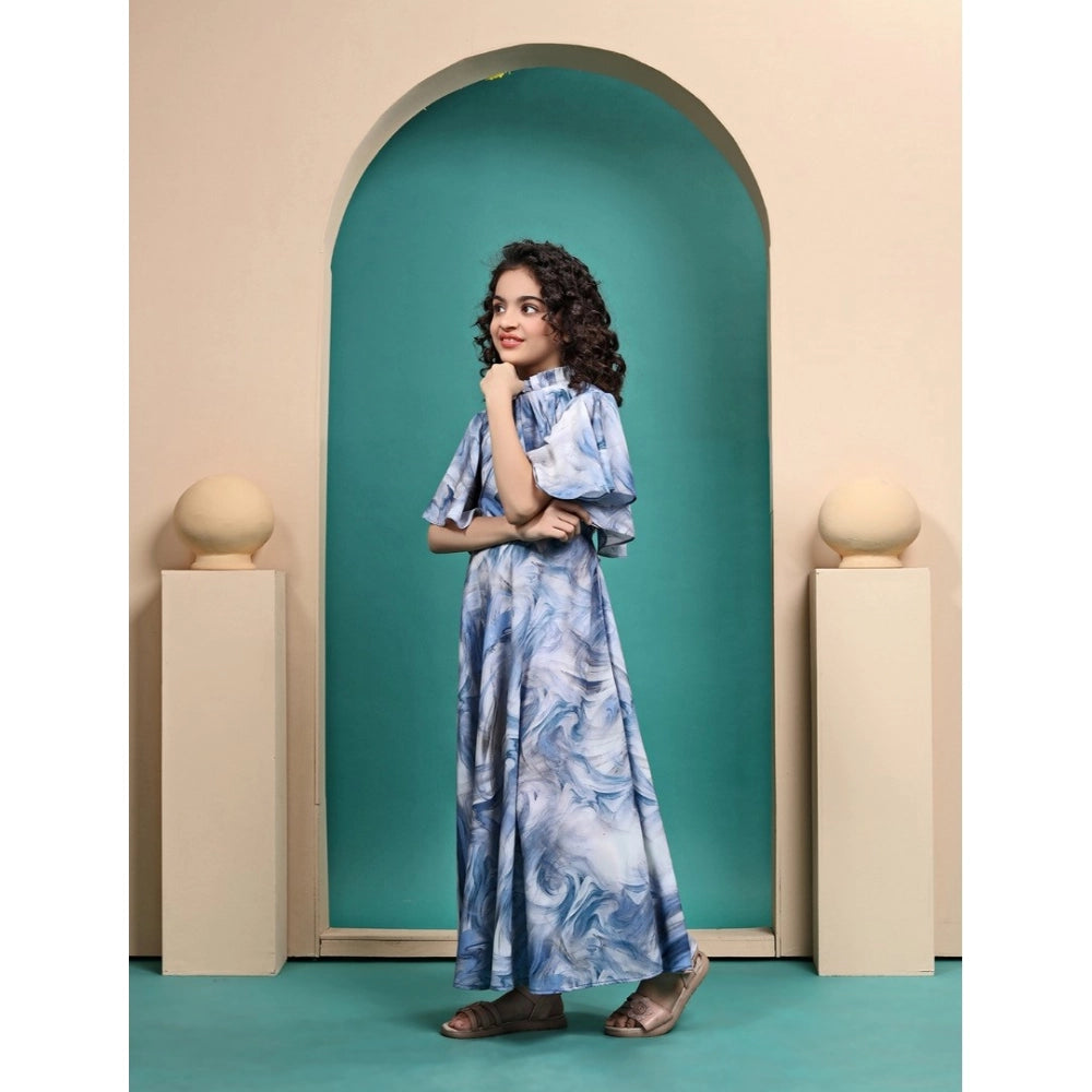 Generic Girl's Maslin Printed Maxi Length Dress (Sky Blue)